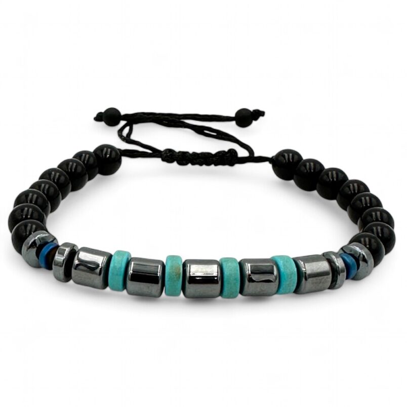 Bransoletka męska makrama to doskonały dodatek do każdej męskiej stylizacji. Po ten rodzaj biżuterii sięga mężczyźni którzy chcą być na czasie , którzy podążają za modą i najnowszymi jej trendami . Biżuteria męska w postaci bransoletek sznurkowych z kamieniami podkreślą styl i charakter mężczyzny, Oferowana w naszym sklepie bransoletka wykonana została z jubilerskiego woskowanego sznurka jubilerskiego który charakteryzuje się trwałością , nie przeciera się . Sznurek wyplatany jest ręcznie , a na nim osadzone są kamienie .