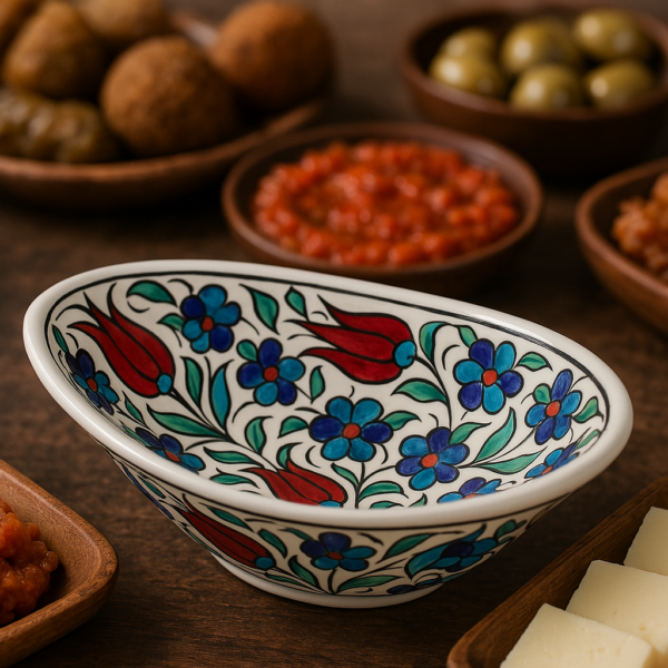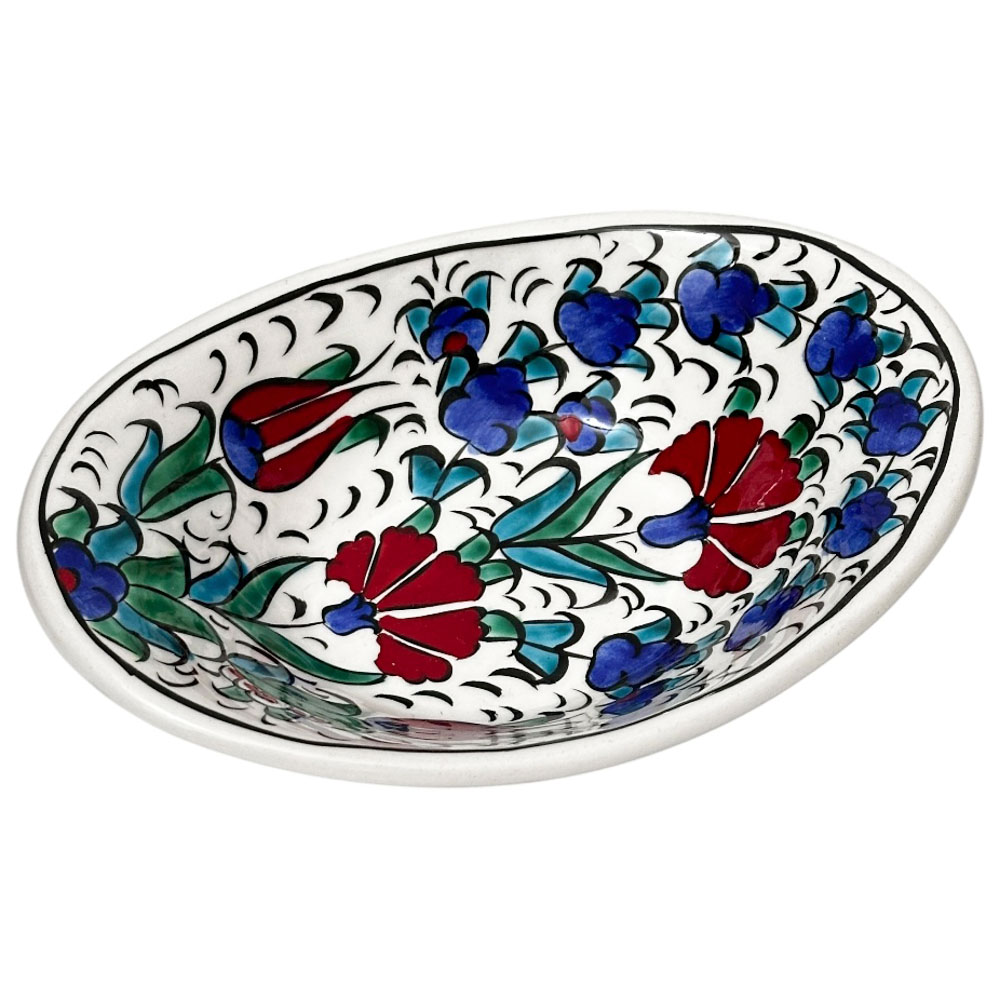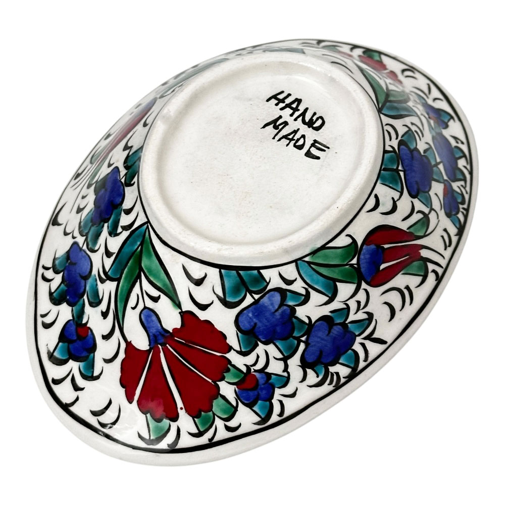 Dodaj do swojej kuchni odrobinę orientalnej elegancji z ręcznie malowaną miseczką turecką wykonaną z wysokiej jakości ceramiki. Ta unikatowa ceramiczna miska to prawdziwe dzieło sztuki, ozdobione klasycznym, osmańskim wzorem przedstawiającym czerwone tulipany oraz niebieskie kwiaty na tle delikatnych, zielonych liści.