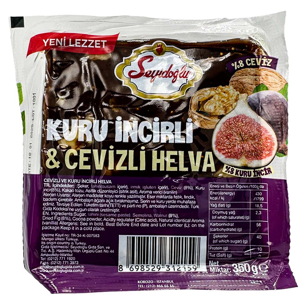 Skład: Cukier, Tahini – Sezam, Semolina, orzechy włoskie 8 %,suszone figi 8 %, kakao , kwasek cytrynowy