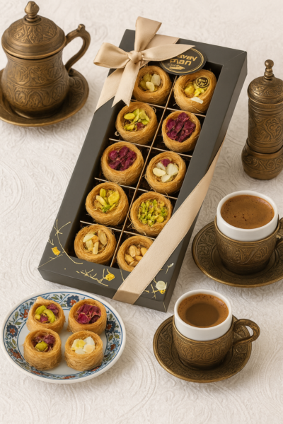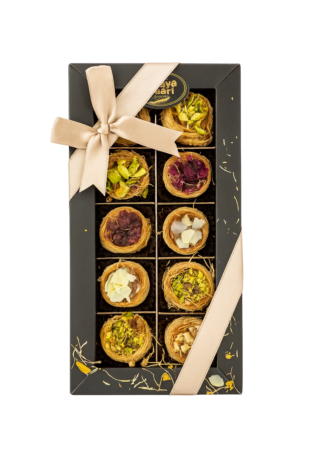 Ciasteczka Kadaif nadziewane kremem z dodatkami orzechów . pistacji i migdałów. Lekkie delikatne ropływają sie w ustach . Chrupiące ciasto kadaiyfi połączone z kremem tworzy wyjątkowa przekąskę idealną do kawy lub herbaty. Całość zapakowana w eleganckie opakowanie.