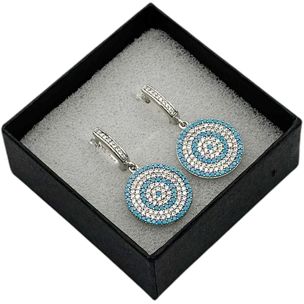 Orientalne Kolczyki z Turcji  to współczesny model biżuterii srebrnej . Kolczyki  zostały wykonana z największa starannością ze srebra p,925 .  Wzór tureckiego symbolu – . Oko Proroka – jest najczęściej kopiowana pamiątka z Turcji . Jest to turecki symbol który chroni osobę posiadającą je przed urokiem i złym okiem . Legenda głosi że kiedy oko pęknie to jego moc zadziałała. W Turcji symbol ten można zobaczyć na każdym kroku między innymi w postaci biżuterii czy ozdób zawieszonych nad progiem domu. Kolczyki srebrne z okiem proroka w tak oryginalnym kształcie idealnie sprawdzą się jako prezent dla osób lubiących turecką biżuterię