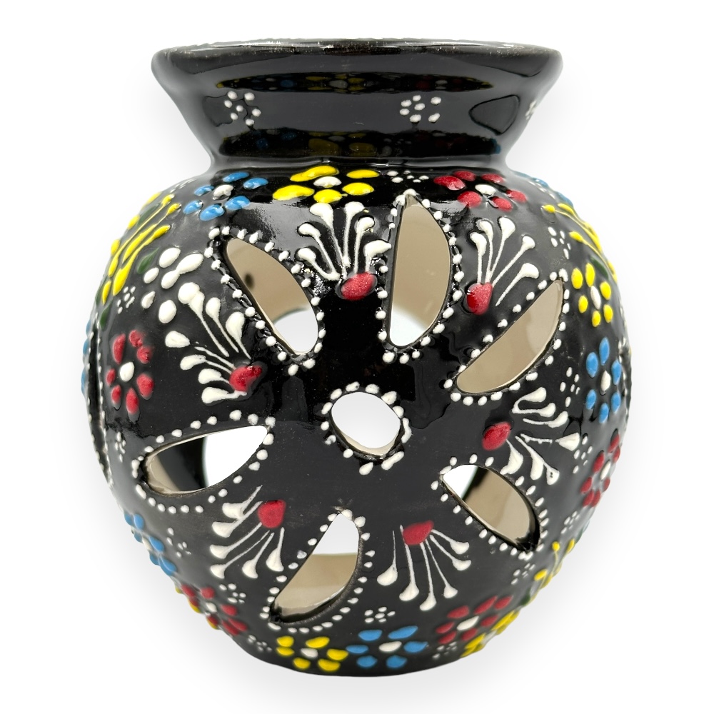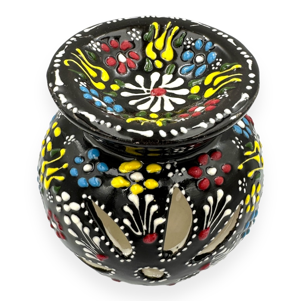 Ten elegancki kominek na olejki eteryczne to połączenie tradycyjnego rzemiosła z nowoczesnym designem. Wykonany ręcznie z najwyższej jakości tureckiej ceramiki, każdy egzemplarz jest unikatowy i może się nieznacznie różnić kształtem, kolorem oraz wzorem, co dodaje mu wyjątkowego charakteru. Bogata paleta barw i oryginalne zdobienia inspirowane są klasyczną sztuką turecką, znana z zamiłowania do detali i harmonii.