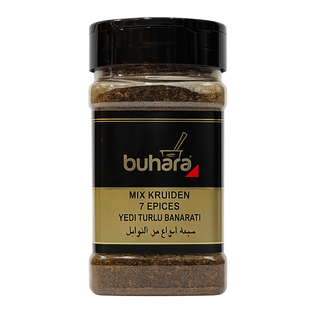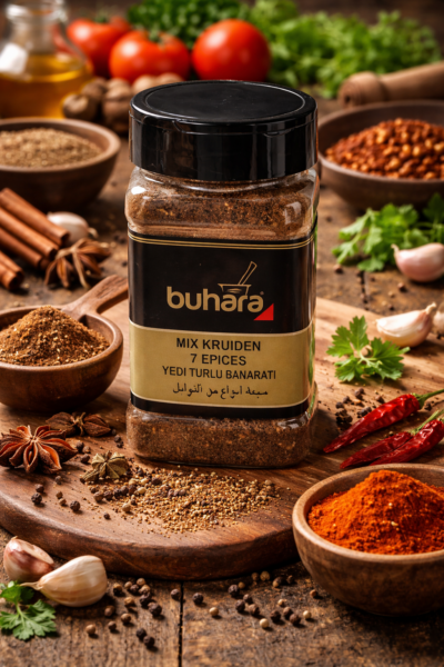 Buhara Mix Kruiden 7 Epices (Yedi Türlü Baharatı) to aromatyczna mieszanka siedmiu starannie dobranych przypraw, inspirowana kuchnią turecką i bliskowschodnią. Intensywny zapach, głęboki smak oraz lekko pikantna nuta sprawiają, że jest to uniwersalna przyprawa do mięs, zup, sosów i dań jednogarnkowych.