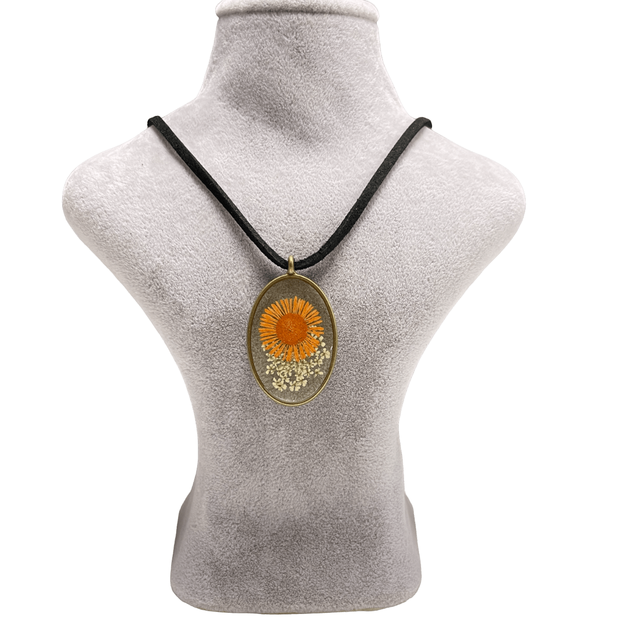 Wisiorek został wykonany z żywicy w której zatopione są zasuszone i odpowiednio przygotowane kwiaty. Wisiorek zawieszony jest na brązowym rzemyku.