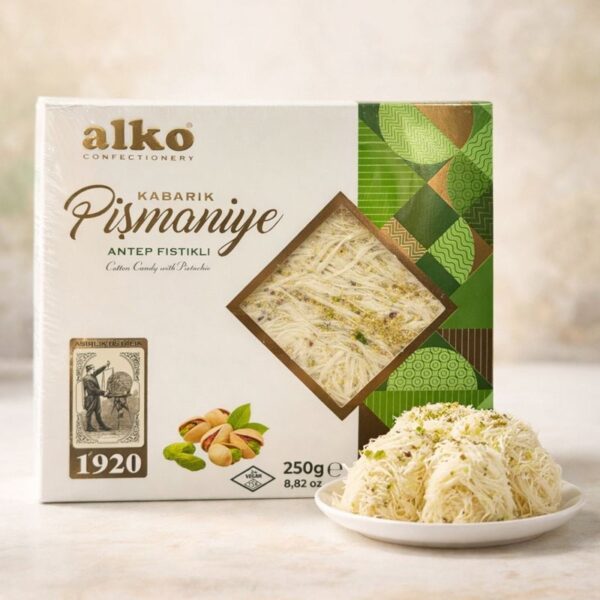 Całość została posypana drobno mielonymi pistacjami Antep, które nadają słodyczy lekko orzechowy charakter i eleganckie wykończenie. Pişmaniye doskonale sprawdzi się jako deser do kawy lub herbaty, słodka przekąska w ciągu dnia, a także jako oryginalny prezent dla miłośników orientalnych smaków.