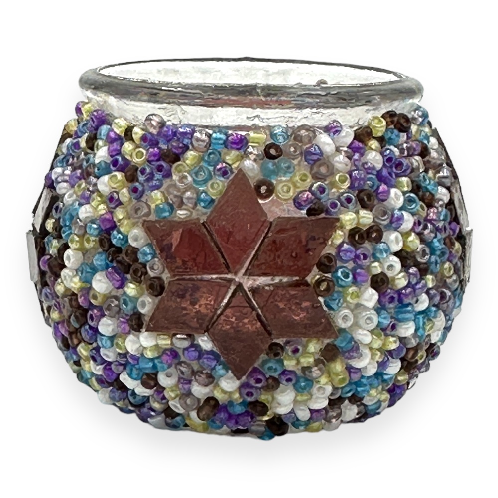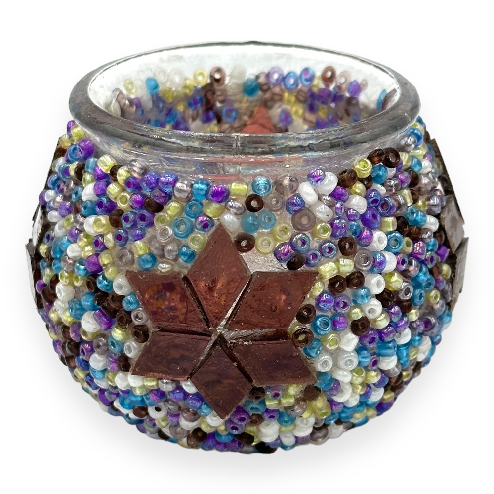 Turecki świecznik mozaikowy wykonany w całości ze szkła wprowadzi do Twojego domu odrobinę tureckiego orientu. Świecznik w całości został wykonał ręcznie  z małych kolorowych barwionych szkiełek które przyklejane tworzą piękną mozaikę . Kolorowe szkiełka w połączeniu ze światłem świecy daję niesamowity klimat. Udekoruj swój dom , taras czy balkon  świecznikami mozaikowymi z Turcji. Do świecznika można używać zarówno tradycyjnych świec jaki i świec typu led.