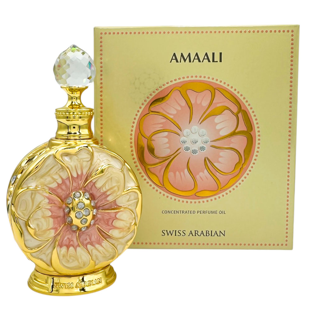 SWISS ARABIAN Amaali to olejek perfumowany dostępny w pojemności 15 ml. Jest to orientalno-kwiatowy zapach, który łączy w sobie nuty owocowe, kwiatowe i drzewne, tworząc luksusową i trwałą kompozycję.