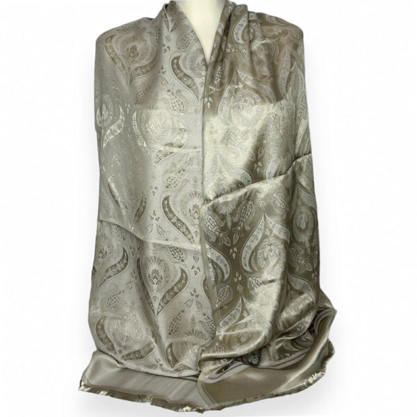 Szykowny szal z Turcji to wyjątkowy dodatek, który ożywi Twoją stylizację. To niezwykle elegancki i subtelny szal, idealny na różne okazje. Wyprodukowany w Turcji, w mieście Bursa, słynącym z produkcji jedwabnych i kaszmirowych szali. Długość dostosowana do swobodnego oplecenia szyi lub noszenia na ramionach. Ten szal to nie tylko modowy akcent, ale również wyraz klasy i gustu. Świetnie sprawdzi się na specjalne okazje, takie jak wesela czy karnawałowe przyjęcia. Będzie idealny jako elegancki szal do sukienki czy płaszcza, żakietu.