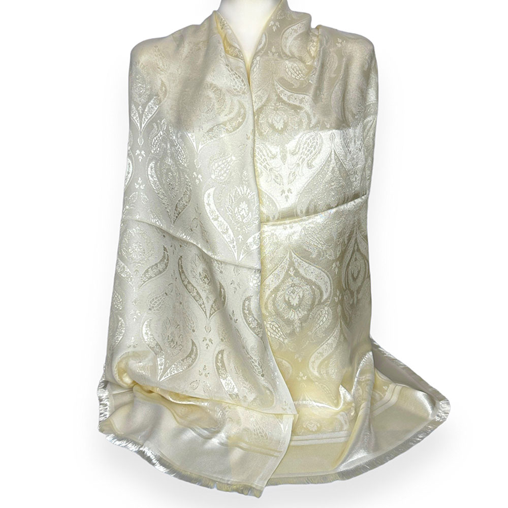Szykowny szal w kolorze ecru to wyjątkowy dodatek, który ożywi Twoją stylizację. To niezwykle elegancki i subtelny szal, idealny na różne okazje. Wyprodukowany w Turcji, w mieście Bursa, słynącym z produkcji jedwabnych i kaszmirowych szali. Długość dostosowana do swobodnego oplecenia szyi lub noszenia na ramionach. Ten szal to nie tylko modowy akcent, ale również wyraz klasy i gustu. Świetnie sprawdzi się na specjalne okazje, takie jak wesela czy karnawałowe przyjęcia. Będzie idealny jako elegancki szal do sukienki czy płaszcza, żakietu.