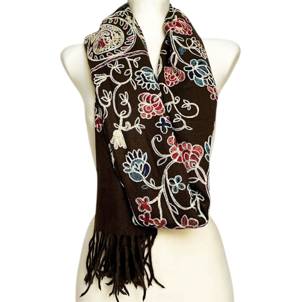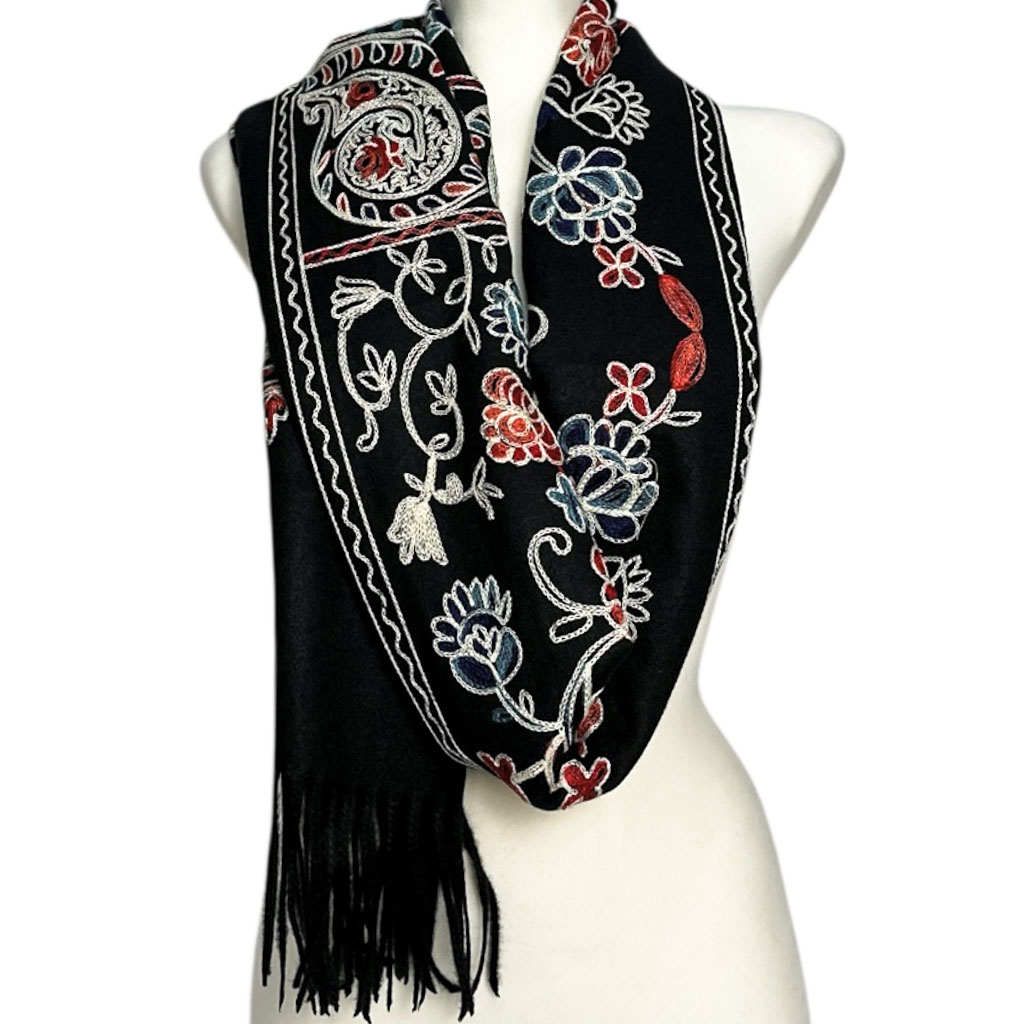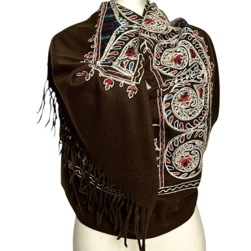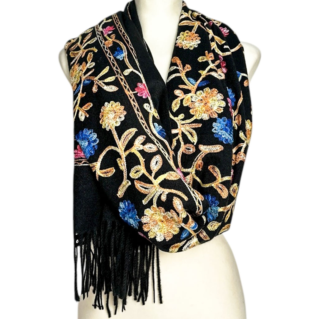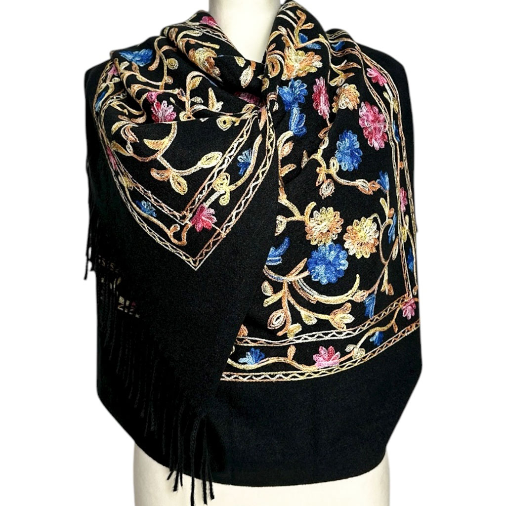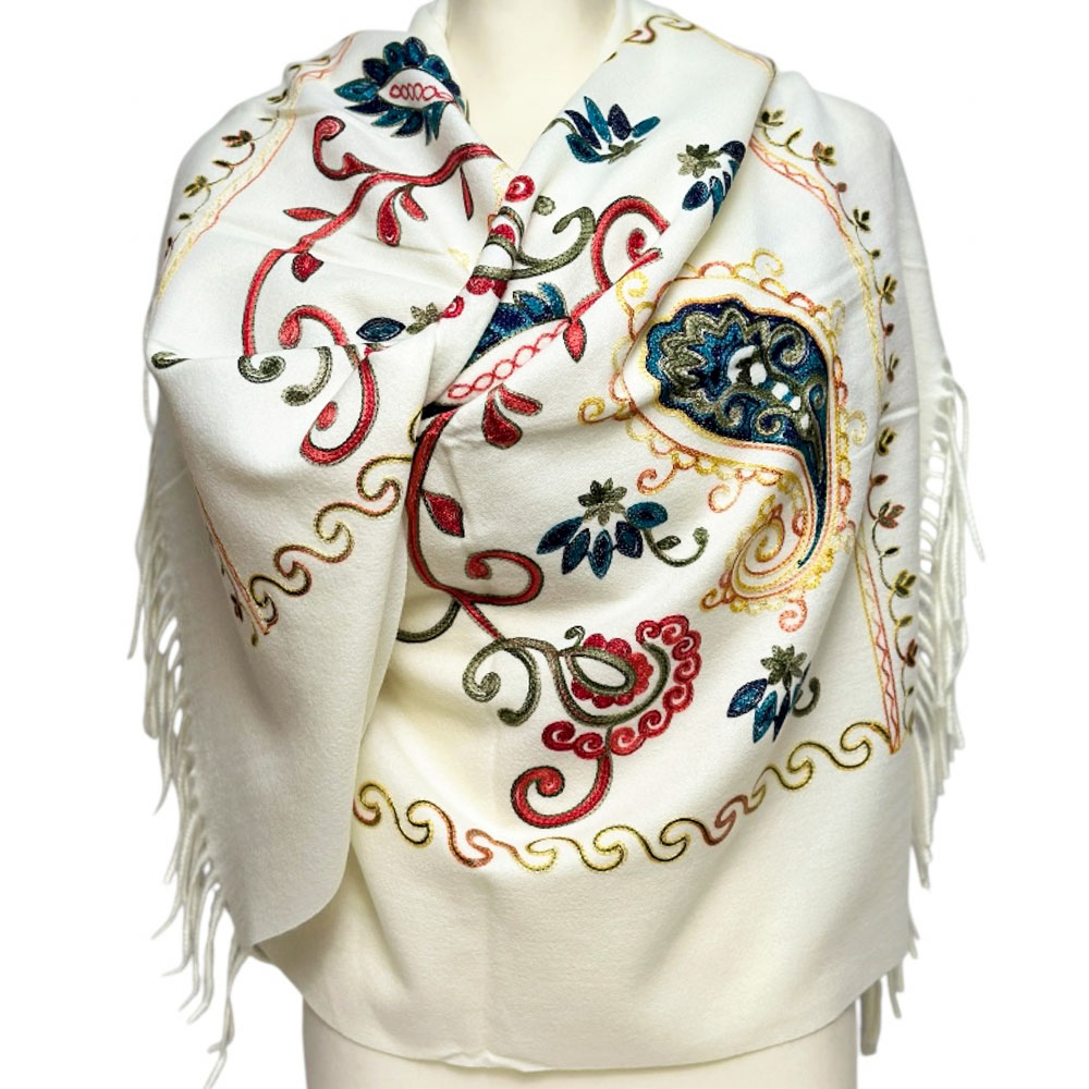 Bogate, kolorowe zdobienia w motywach kwiatowych i paisley nadają szalowi wyjątkowego charakteru. Precyzyjny haft podkreśla jego elegancję, czyniąc go dodatkiem idealnym zarówno na co dzień, jak i na wyjątkowe okazje.