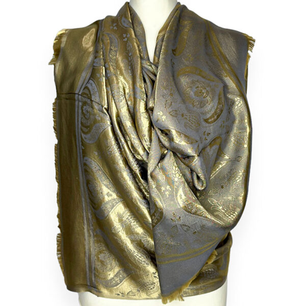 Szykowny szal w kolorze szary złotym to wyjątkowy dodatek, który ożywi Twoją stylizację. To niezwykle elegancki i subtelny szal, idealny na różne okazje. Wyprodukowany w Turcji, w mieście Bursa, słynącym z produkcji jedwabnych i kaszmirowych szali. Długość dostosowana do swobodnego oplecenia szyi lub noszenia na ramionach. Ten szal to nie tylko modowy akcent, ale również wyraz klasy i gustu. Świetnie sprawdzi się na specjalne okazje, takie jak wesela czy karnawałowe przyjęcia. Będzie idealny jako elegancki szal do sukienki czy płaszcza, żakietu.