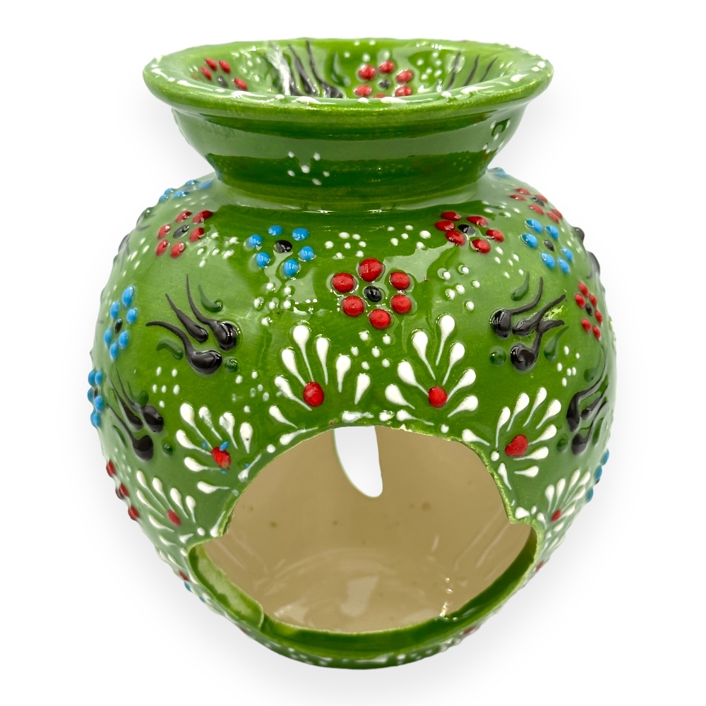 Ten elegancki kominek na olejki eteryczne to połączenie tradycyjnego rzemiosła z nowoczesnym designem. Wykonany ręcznie z najwyższej jakości tureckiej ceramiki, każdy egzemplarz jest unikatowy i może się nieznacznie różnić kształtem, kolorem oraz wzorem, co dodaje mu wyjątkowego charakteru. Bogata paleta barw i oryginalne zdobienia inspirowane są klasyczną sztuką turecką, znana z zamiłowania do detali i harmonii.